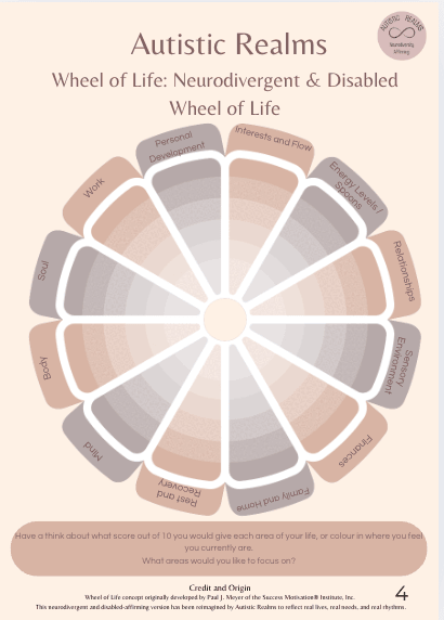 The Neuro-Affirming Wheel of Life is designed for neurodivergent & disabled people, this gentle tool helps you reflect on your energy, flow, sensory needs, and more. Honour your own rhythms and flow.